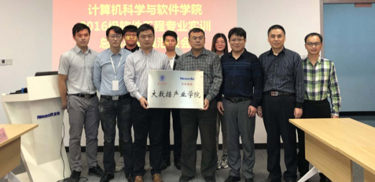 本网讯 近日,计算机学院组织开展“2016级软件工程专业东软睿道班毕业实习总结与成果汇报会”,并在合作企业举行“bat365正版唯一官网大数据产业学院”挂牌仪式。bat365教务处、计算机学院有关负责人,东软睿道教育信息技术有限公司有关负责人共同参加。