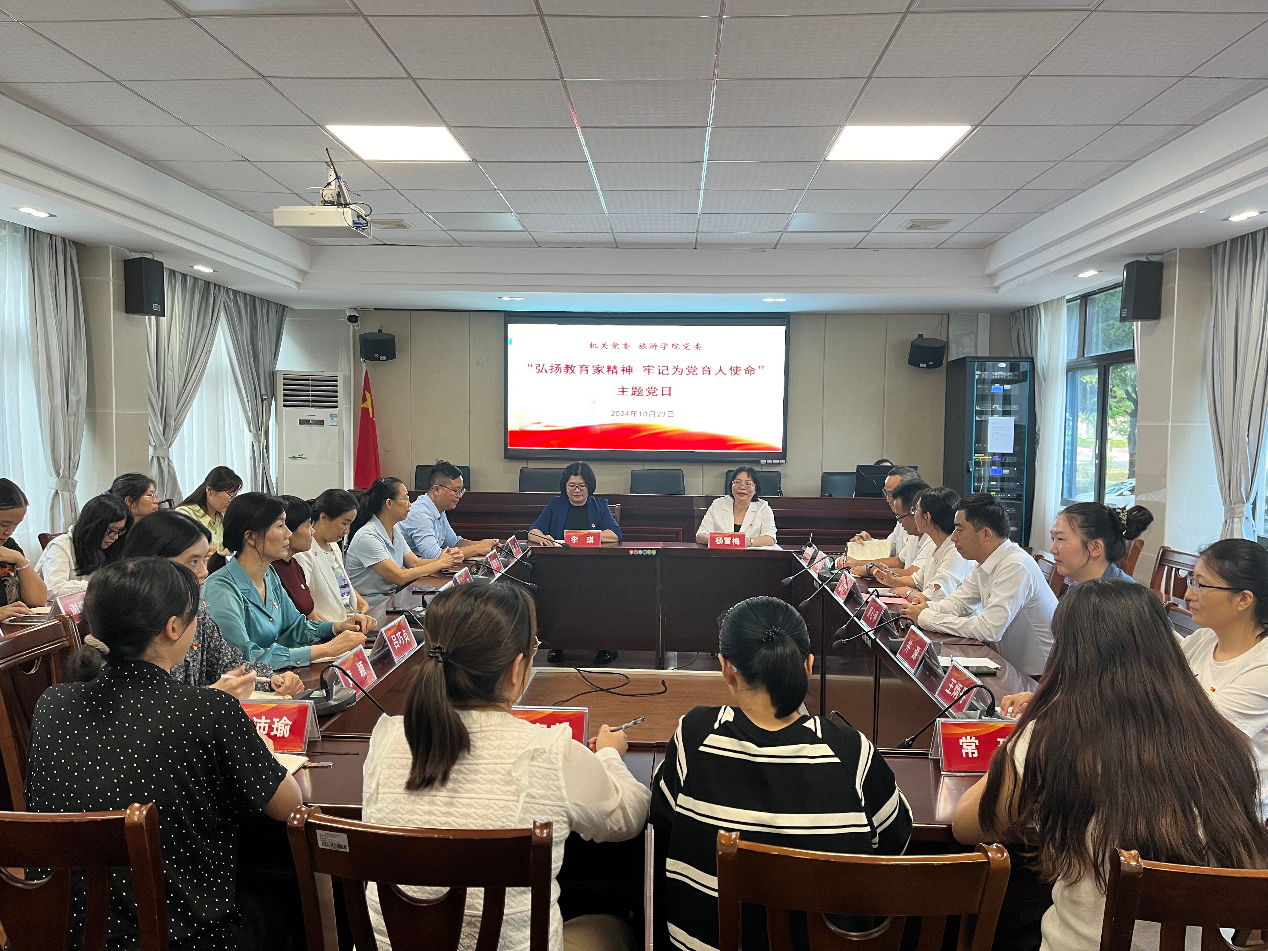 本网讯 为深入贯彻落实党的二十大和二十届三中全会精神,全面学习贯彻习近平总书记在全国教育大会上的重要讲话精神,激发党建活力,促进党建业务融合发展,10月23日,机关党委、旅游学院党委联合举行“弘扬教育家精神 牢记为党育人使命”主题党日活动。机关党委书记李琪、旅游学院党委书记杨雪梅以及党员代表参加。