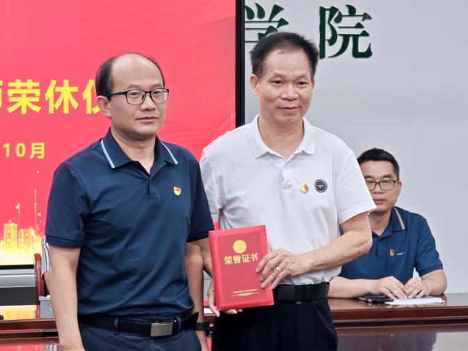 汪洪武为莫灿坤老师颁发荣休证书,表达对莫灿坤老师崇高的敬意和深深的祝福,希望他能够继续关心学院的发展,继续为学院的发展献计献策,并号召全院青年教师们以荣休教师为榜样,沿着优秀前辈的足迹,为教育事业而努力奋斗。