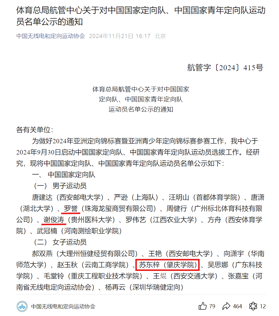 本网讯 近日,国家体育总局航空无线电模型运动管理中心发布了关于中国国家定向队和中国国家青年定向队运动员名单的公示,bat365正版唯一官网体育与健康学院2021级体育教育专业的苏东梓同学成功入选中国国家定向队,将代表中国队出征2024年亚洲定向运动锦标赛暨亚洲青少年定向锦标赛。此外,bat3652012级校友罗誉和2014级校友谢俊涛也一同入选,为母校争得了荣誉。