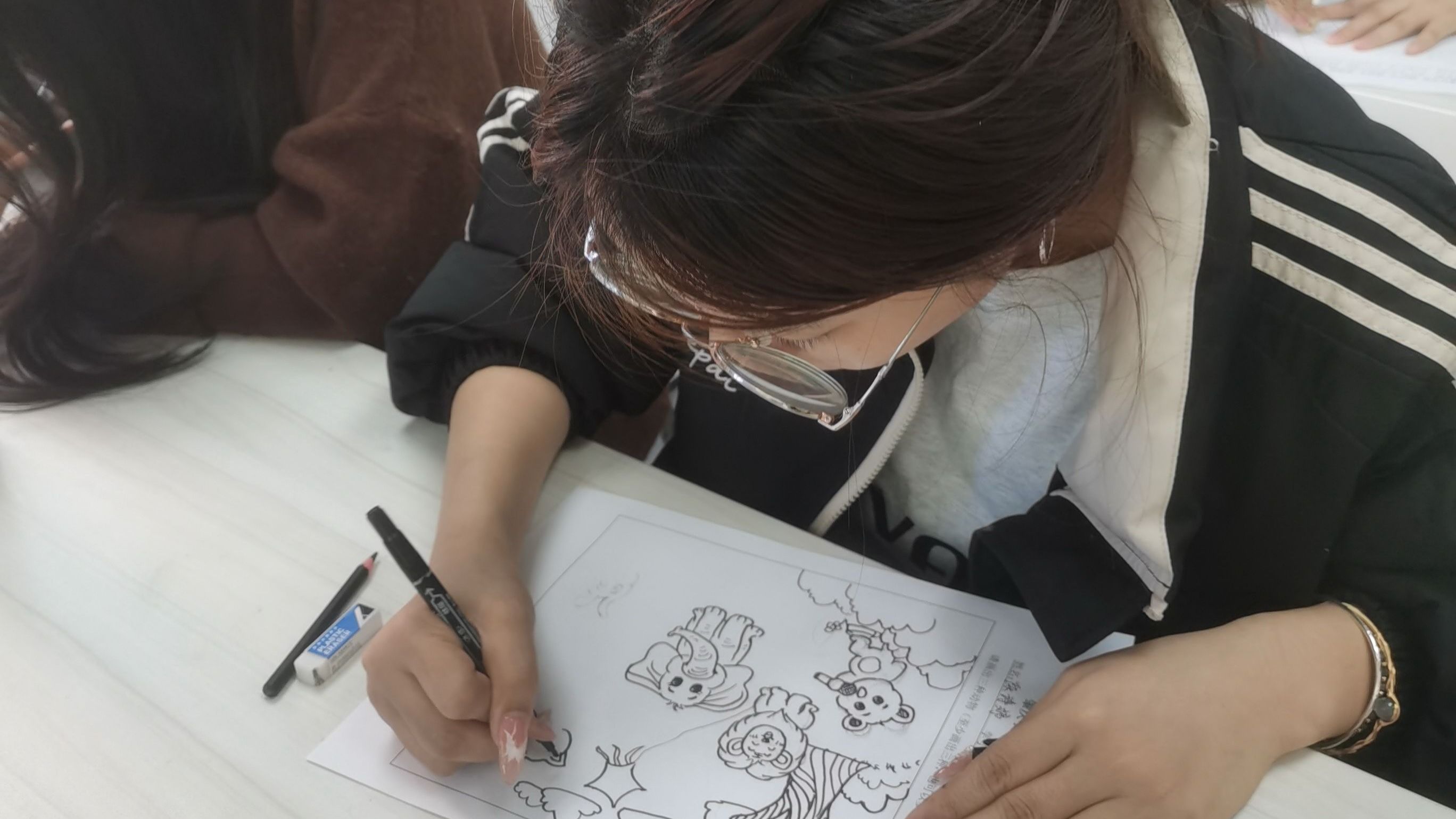 钢笔字比赛中,选手们须在15分钟内现场书写指定内容,字迹清晰、笔力遒劲,展现了良好的书法基础。简笔画比赛环节中,选手们根据文字提示迅速构思、现场作画,展现了创意与技艺的结合。粉笔字比赛则在板书长廊进行,选手们须在10分钟内完成作品,字形优美、结构严谨,体现了规范汉字书写能力。