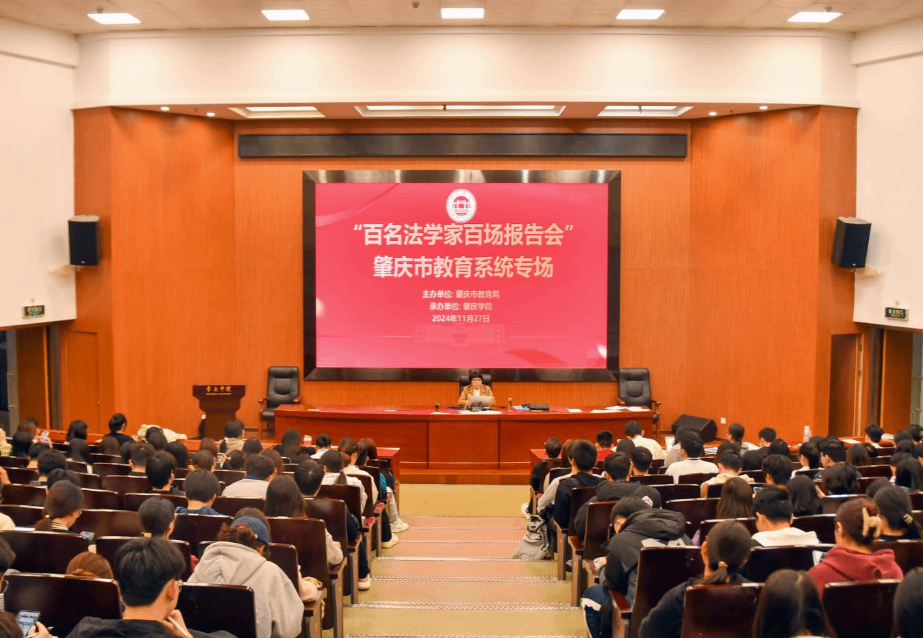本网讯 11月27日,“百名法学家百场报告会”法治宣讲活动肇庆市教育系统专场在bat365举行。政法学院院长许英主讲,近400名学生参加。