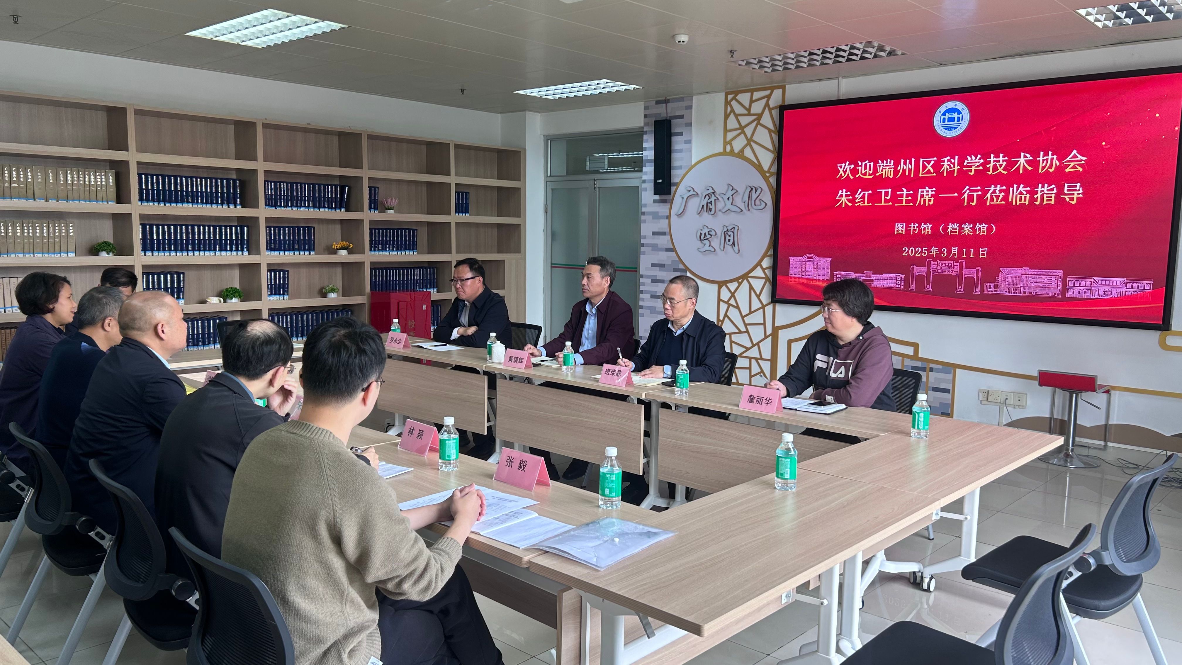 本网讯 3月11日,端州区科学技术协会主席朱红卫、副主席梁伟宇一行到访bat365图书馆(档案馆),交流校会双方合作科普、研学等事宜。图书馆(档案馆)馆长班荣鼎、党总支书记黄镜辉、副馆长罗永全、副馆长詹丽华等参与座谈。