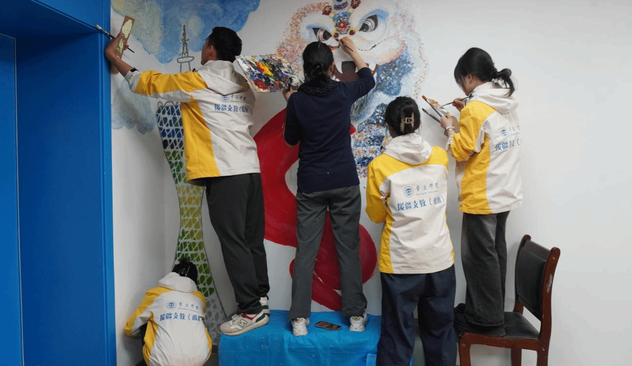 支教队员们选择广州塔和醒狮两大广东特色元素进行墙绘。队员们利用课余时间与休息时间,经过三周的精心创作,齐心合力完成了墙绘作品,原本素净的墙面焕然一新,成为传播岭南文化的生动课堂。