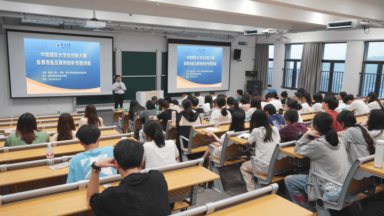 本网讯 4月23日,创新创业学院邀请中国国际大学生创新大赛国赛评委、韶关学院创新创业院长程金生教授到校开展专题讲座,以“中国国际大学生创新大赛备赛准备及案例剖析”为主题作分享。各二级学院负责创新创业工作的教师、创新创业教育菁英班学员、砚园创谷入驻团队等近百名师生参与。讲座由创新创业学院院长唐文武主持。