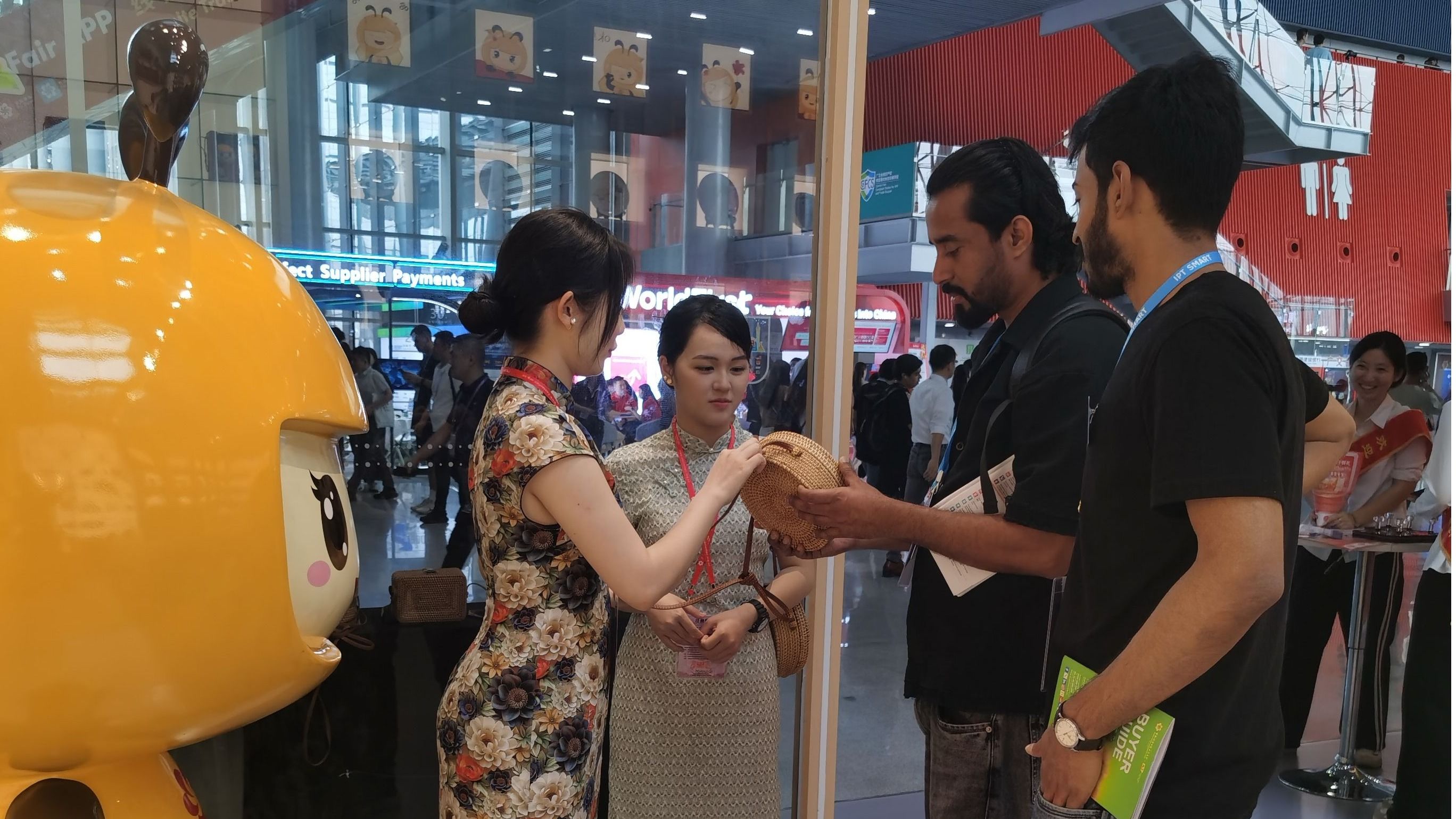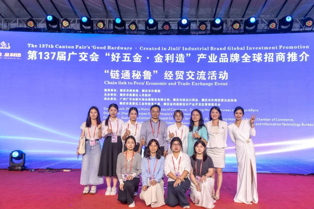 在广交会现场,学生们深度参与展位翻译、客户对接、商务洽谈等环节,为来自中东、东南亚、欧美等地区的国际客商提供语言支持。在高要新桥洋篮文化展区,张净旗、谢逸瑾等同学担任的翻译志愿者,向外国采购商介绍国家级非遗洋篮的历史与工艺。还有同学参与“好五金·金利造”产业品牌全球招商推介“链通秘鲁”经贸交流活动,为客商代表与肇庆高要金利五金企业代表搭建沟通的桥梁。