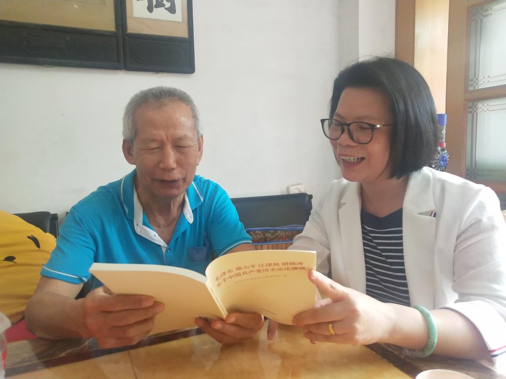 离退休党总支副书记黎玉玲带队送学上门并与老党员梁岳研讨,梁岳感言:学党史,不忘初心。今年是中国共产党成立100周年,学习党史,是党中央作出的重要部署。最近,我学习了党总支和党支部提供的中国共产党党史资料,观看了《毛泽东》、《朱德元帅》、《彭德怀元帅》、《觉醒年代》《外交风云》、《五星红旗迎风飘扬》等电视剧,加深了对党史的认识。回顾这一百年,中国共产党人走过了一段艰苦卓绝的奋斗历程。一百年来,我们从星星之火,到走向民族独立、繁荣昌盛,从最初一个内忧外患、积贫积弱的“东方雄狮”,成为经济总量居于世界第二的经济大国,走在了世界的前列。