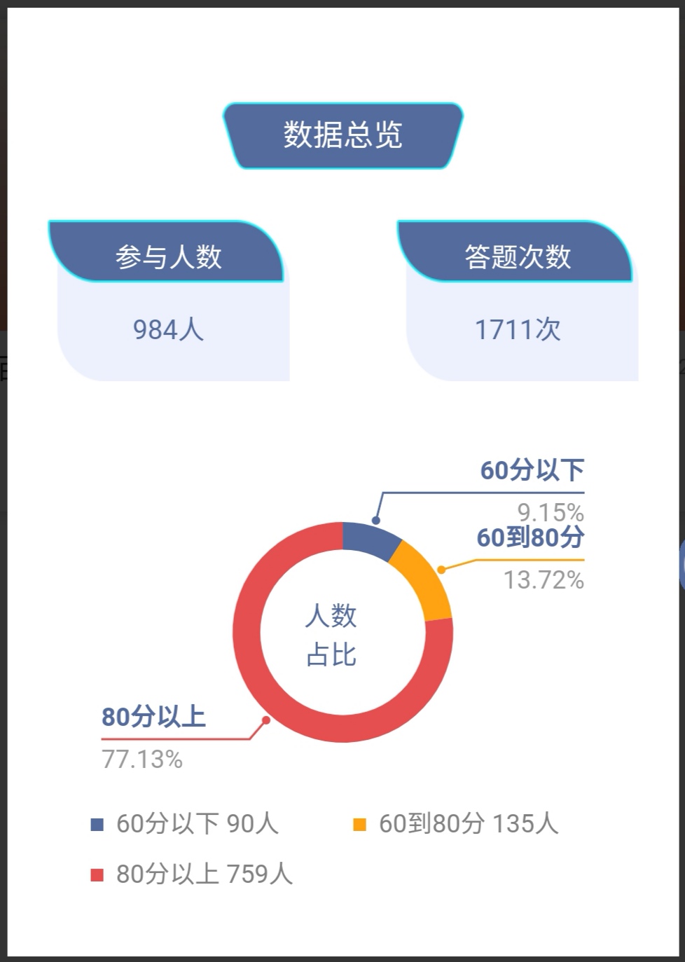 本次党史知识竞答活动于3月下旬启动,图书馆分别在网站和微信公众号上发布活动通知,鼓励二级学院踊跃参与。在各二级学院的精心组织下,全校共有984人参与竞答,答题1711次,80分以上759人,占比77.13%,在全国排名第47。