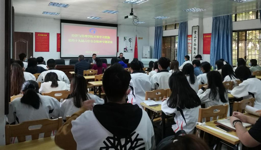 本网讯 1月8日,经济与管理学院邀请马克思主义学院谢石生博士来院作党的十九届六中全会精神专题讲座,学院中层领导干部、师生党员、发展对象、入党积极分子及入党申请人共70人出席。