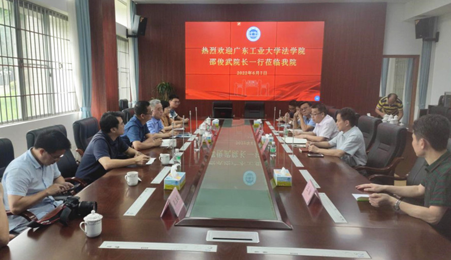 本网讯 6月7日,广东工业大学法学院院长邵俊武、党委书记黄培清等一行到访政法学院、知识产权学院,就学科建设、人才培养、队伍建设、学术研究和社会服务等事宜开展交流。政法学院院长祁建平、党委书记侯玉基等领导班子成员和教师代表参加。