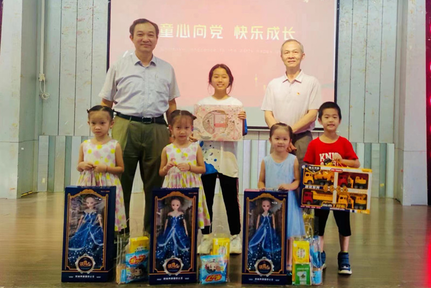 在派发活动纪念品现场,校工会副主席周东和关工委常务副主任蓝世光为三个组别(幼儿组、小学组、初中组)的儿童代表颁发了纪念品,并殷切叮嘱他们要听党话、感恩党、跟党走,努力学习、健康成长,勇做担当民族复兴大任的时代新人。