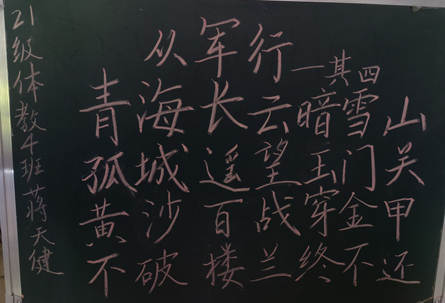 图片说明:板书是师范技能的重要组成部分。新学期开学以来,体育与健康学院组织体教专业学子积极开展板书技能训练,取得良好效果。板书练习锻炼了同学们的书写能力,提升了大家对于未来走上教学岗位、做好育人工作的信心。