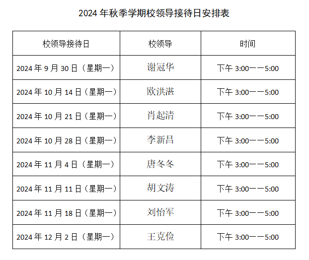 请有意来访的师生员工于校领导接待日的前一周周五下午17:00前填写附件1-《bat365正版唯一官网校领导接待日预约登记表》并发送至电子邮箱huangzuxin@zqu.edu.cn进行预约,党政办公室协调安排后,将通知预约人具体接待时间。