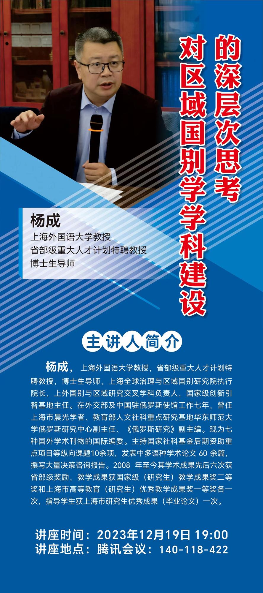 三、讲座主讲:杨成,上海外国语大学教授,省部级重大人才计划特聘教授,博士生导师,上海全球治理与区域国别研究院执行院长,上外国别与区域研究交叉学科负责人,国家级创新引智基地主任。在外交部及中国驻俄罗斯使馆工作七年,曾任上海市晨光学者、教育部人文社科重点研究基地华东师范大学俄罗斯研究中心副主任、《俄罗斯研究》副主编。现为七种国外学术刊物的国际编委。主持国家社科基金后期资助重点项目等纵向课题10余项,发表中多语种学术论文 60 余篇,撰写大量决策咨询报告。2008 年至今其学术成果先后六次获省部级奖励,教学成果获国家级(研究生)教学成果奖二等奖和上海市高等教育(研究生)优秀教学成果奖一等奖各一次,指导学生获上海市研究生优秀成果(毕业论文)