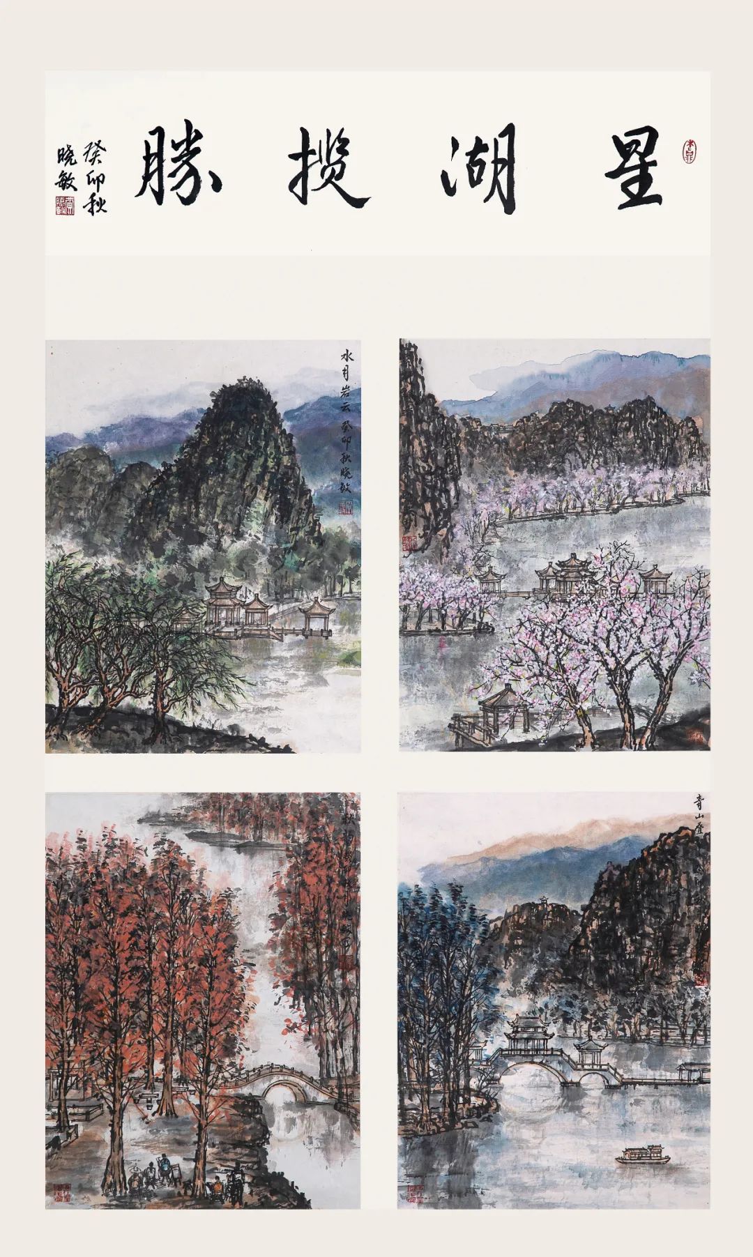 广发银行肇庆分行 黄晓敏《星湖揽胜》(作品是以中国画写生的形式描绘了星湖不同季节、不同角度的美丽风光,《水月岩云》《紫荆飘香》《青山叠翠》《秋韵》组合成星湖揽胜的组图,抒发了对肇庆绿水青山的热爱,用画笔记录城市之美、生活之美、岁月静好)