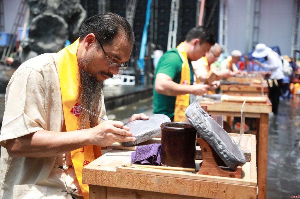 在“在水一方”文化创意集市,端砚艺人现场展示端砚技艺。西江日报记者 刘春林 摄