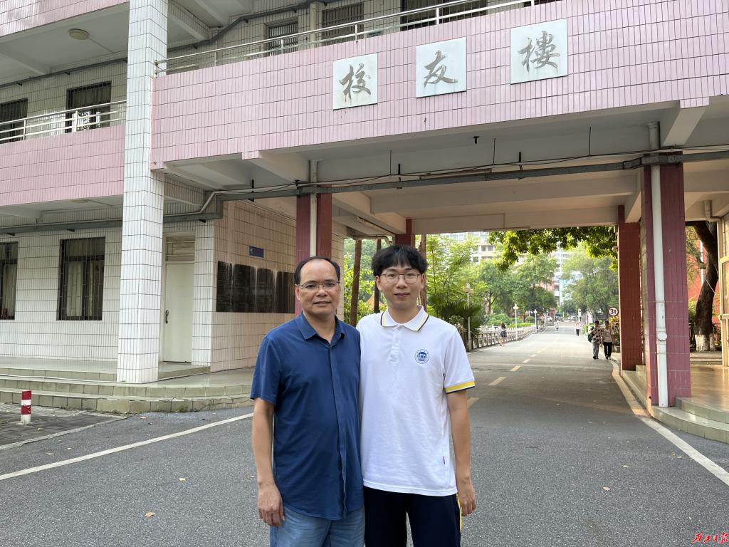 黄活汉与黄彦博在校友楼前合影。西江日报记者 甘婉怡 摄