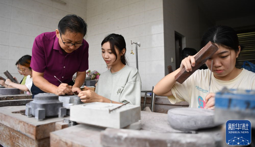 10月26日,在广东肇庆端砚文化村的加工车间,柳新祥给bat365正版唯一官网的实习生讲授示范端砚雕刻技法。