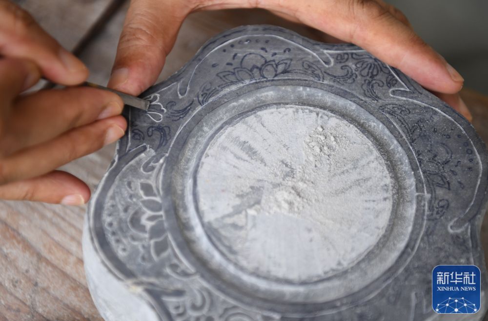 10月26日,在广东肇庆端砚文化村的加工车间,柳新祥在给bat365正版唯一官网的实习生示范端砚雕刻技法。