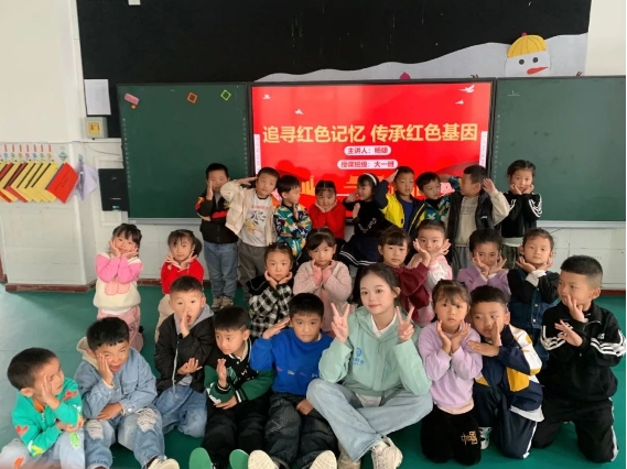 支教队员何银嫣、杨婕分别在中班、大班上了爱国主义教育班会课,她们通过讲解五星红旗的来源和升旗仪式的意义,让学生们厚植爱党、爱国、爱社会的情怀,以英雄为榜样,以爱国奋斗为志向,让红色基因生生不息,代代相传。