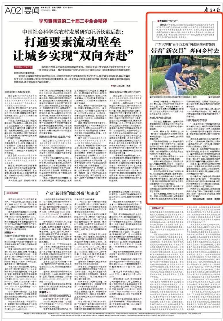 新种苗、种植课程、AI照管果树……这个夏天,超10万名广东学子组成“百千万工程”突击队,奔赴全省县镇村。其中有不少学子依靠科技智慧和科技知识,让实验室成果在乡村开花结果,为当地农业生产注入新活力。