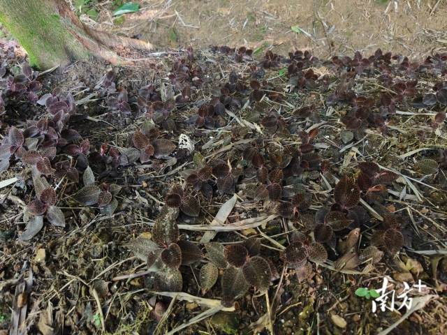 在肇庆四会市石狗镇的一片野生树林中,阳光穿过树叶的缝隙,在一片种植地上投下晃动的光斑。地里所种植物名为金线莲,是广东、福建等地的传统珍贵药材,因其叶脉呈金色网状而得名。