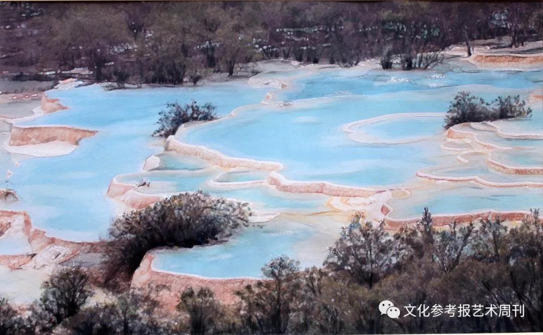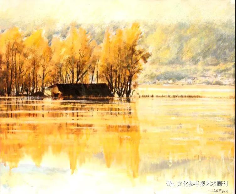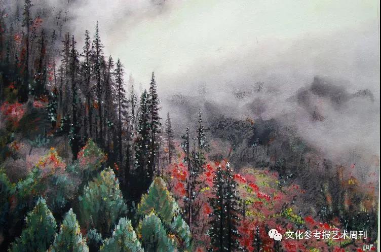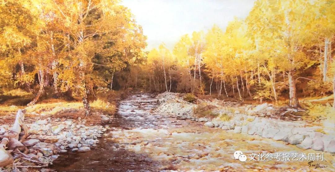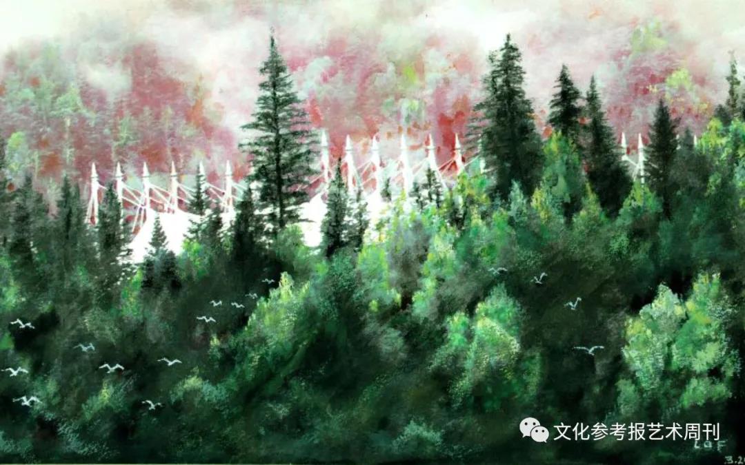 罗秋帆《壮丽河山系列》水彩画,流光溢彩,顿觉满室生辉,它代表了画家当前的创作状态和创作水平,这是一个很有份量的阶段性总结。《壮丽河山系列》以高大茂密的杉树林为画面主体景物的风景画,作者一反传统水彩画强调透明性的水分的常用技巧技法,运用水彩画和油画的艺术手段,色彩艳丽夺目,厚重充实又丰富微妙,极具空间感的层次,气象万千,大壮大美地表现了北方春浓、秋深的迷人景色,令人沉醉和遐思。