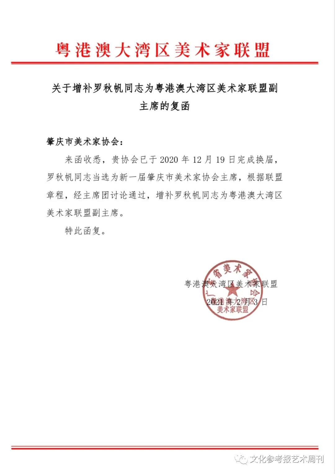 2020年12月19日下午,肇庆市美术家协会第六次会员代表大会在肇庆市工人文化宫召开,开选举产生了肇庆市美协第六届主席团。罗秋帆当选新一届肇庆市美术家协会主席。