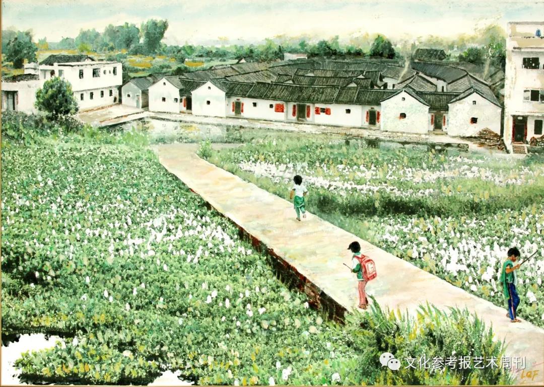 《童年的回忆》以客家地区经典古老的特有的围龙屋占据画面的主体,屋后绿色屏障般的高高的竹林、和禾坪前清澈如镜的池塘倒影,池塘前面翠绿的稻田和繁星般的浮莲花,正在忙碌插秧的农民和诱钓青蛙的小孩,织成了客家农村春意盎然、生机勃勃的田园风情画卷,令人赏心悦目,如饮甘醇可口的客家娘酒,沁入肺腑,从中也可体味到画家那深深的故土情怀。(文/陈其伟,兴宁市美术家协会名誉主席)
