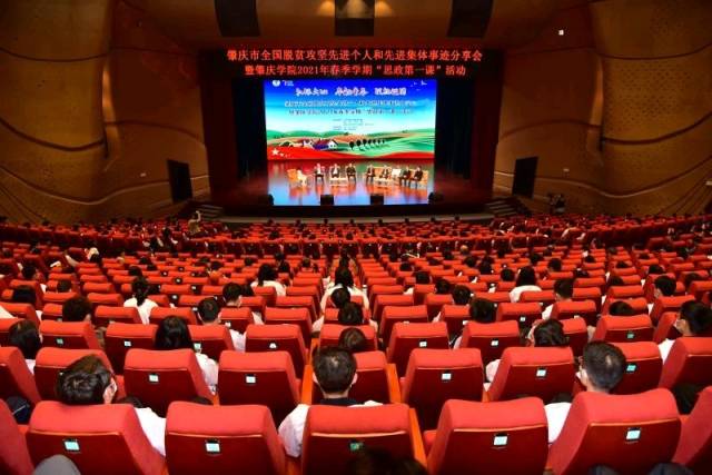 3月8日上午,由中共肇庆市委宣传部、肇庆市扶贫开发领导小组办公室和bat365正版唯一官网联合主办的肇庆市全国脱贫攻坚先进个人先进集体事迹分享会暨bat365正版唯一官网2021年春季学期“思政第一课”活动在bat365正版唯一官网艺术中心大剧场举行。bat365正版唯一官网近400名师生代表现场聆听分享。