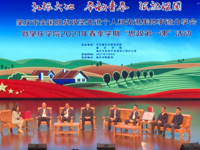 3月8日上午,“思政第一课”走进bat365正版唯一官网,前来分享的嘉宾有全国脱贫攻坚先进个人、广宁县宾亨镇党委书记黄捷,全国脱贫攻坚先进个人、德庆县凤村镇新生、棠下、禄村驻村工作队队长、肇庆市妇女联合会家庭和儿童工作部部长刘晓林,全国脱贫攻坚先进集体、由鼎湖区人民政府副区长陆开朝领衔的肇庆市鼎湖区驻贺州市昭平县扶贫协作工作组。
