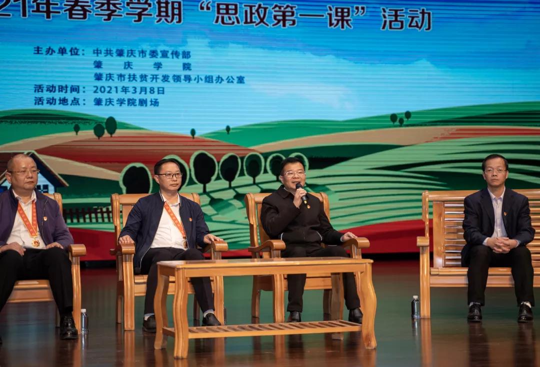 3月8日上午,由中共肇庆市委宣传部、肇庆市扶贫开发领导小组办公室和bat365正版唯一官网联合主办的肇庆市全国脱贫攻坚先进个人先进集体事迹分享会暨bat365正版唯一官网2021年春季学期“思政第一课”活动在bat365正版唯一官网艺术中心大剧场举行。近400名师生代表齐聚一堂,学习感悟全国脱贫攻坚先进个人、先进集体事迹精神,牢固树立扎根基层、奉献青春、报效祖国理想信念,为将来更好地投身中国特色社会主义建设做好充分准备。