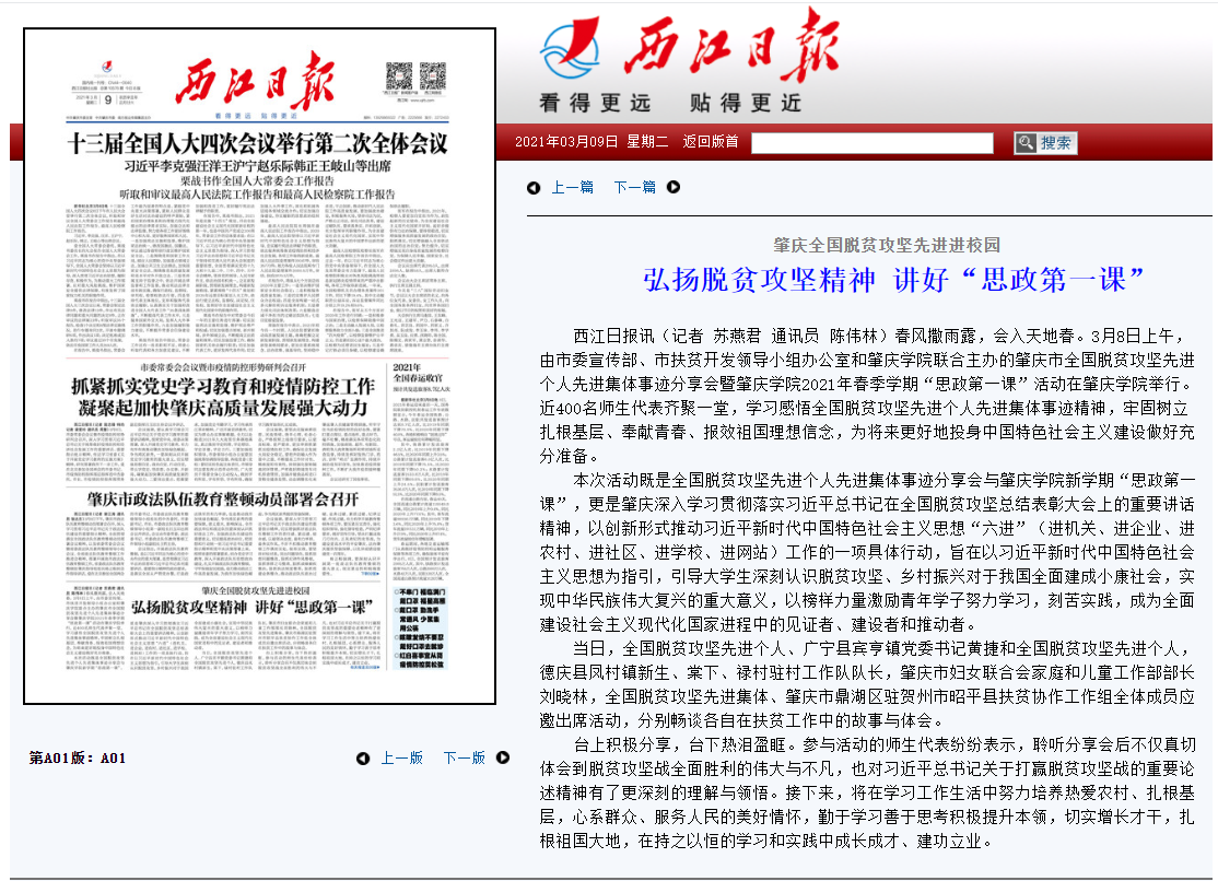 春风撒雨露,会入天地春。3月8日上午,由市委宣传部、市扶贫开发领导小组办公室和bat365正版唯一官网联合主办的肇庆市全国脱贫攻坚先进个人先进集体事迹分享会暨bat365正版唯一官网2021年春季学期“思政第一课”活动在bat365正版唯一官网举行。近400名师生代表齐聚一堂,学习感悟全国脱贫攻坚先进个人先进集体事迹精神,牢固树立扎根基层、奉献青春、报效祖国理想信念,为将来更好地投身中国特色社会主义建设做好充分准备。