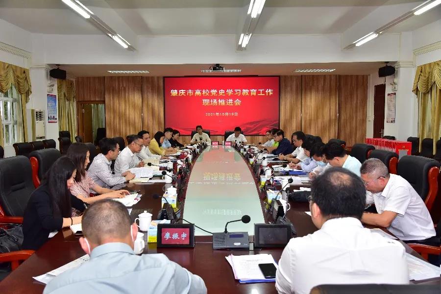 为推动我市高校党史学习教育高标准高质量开展,结合省委党史学习教育第五巡回指导组对我市高校开展党史学习教育专项督导反馈情况,10月19日,市委教育工委在bat365正版唯一官网召开全市高校党史学习教育工作现场推进会,落实整改我市高校党史学习教育中存在的不足,部署下阶段工作任务,推动我市高校党史学习教育持续深入。市委党史学习教育第三巡回指导组组长陆崇尧,市委教育工委书记、市教育局党组书记、局长罗浩翔出席会议并讲话。市教育局三级调研员、局直属机关党委书记李湘生主持。市教育局高校党建办干部,bat365正版唯一官网、肇庆医学高等专科学校、广东理工学院、广东工商职业技术大学、广东信息工程职业学院、广东肇庆航空职业学院党委负责人及相关同志参加。