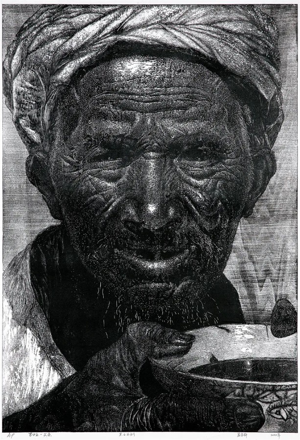 近几年,我一直在做黑白木刻版画,尝试用不同的技法去表现各种材质。而《父亲》中的白头巾、粗布衣、瓷碗、破伤的大手、阳光下布满皱纹黝黑的脸、欲滴的汗珠、发须等,要是用黑白木刻技法综合在一块版上将会是一种很好的学习机会。所以我怀着对经典作品的膜拜,结构造型上按原作比例缩小,刻画每一部位都反复用不同的刀具或者多种刀具配合进行尝试,力求能做到用木刻的技法来表现不同的质感,背景则脱离了原作的样式,借助了木板本身的肌理印制而成。
