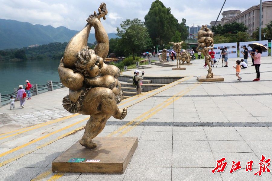 孩子和雕塑互动。西江日报记者 曹笑 摄