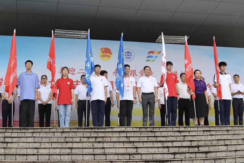 出征仪式上,吴业春、谢冠华、肖起清、陈素芳分别为省级专项服务队代表、省级重点团队代表、校级立项团队代表以及砚园青马第十二批党团员大学生基层实践队代表授旗,鼓励他们在社会实践大课堂中践行“请党放心、强国有我”的青春誓言。