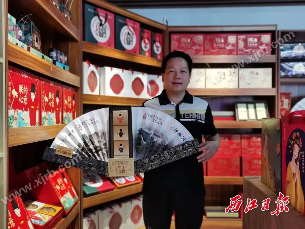 “月光宝盒”的创意源于周星驰的电影,单是设计稿就花了2个月。期间,我们一直在琢磨如何能更好地将肇庆的旅游文化融入其中。设计稿敲定后,打样亦是一项“大工程”,扇面用料很是讲究,一开始选用的是宣纸,但扇形效果不佳。经过多次调整优化,我们最终选择固定效果和韧性较好的铜版纸。