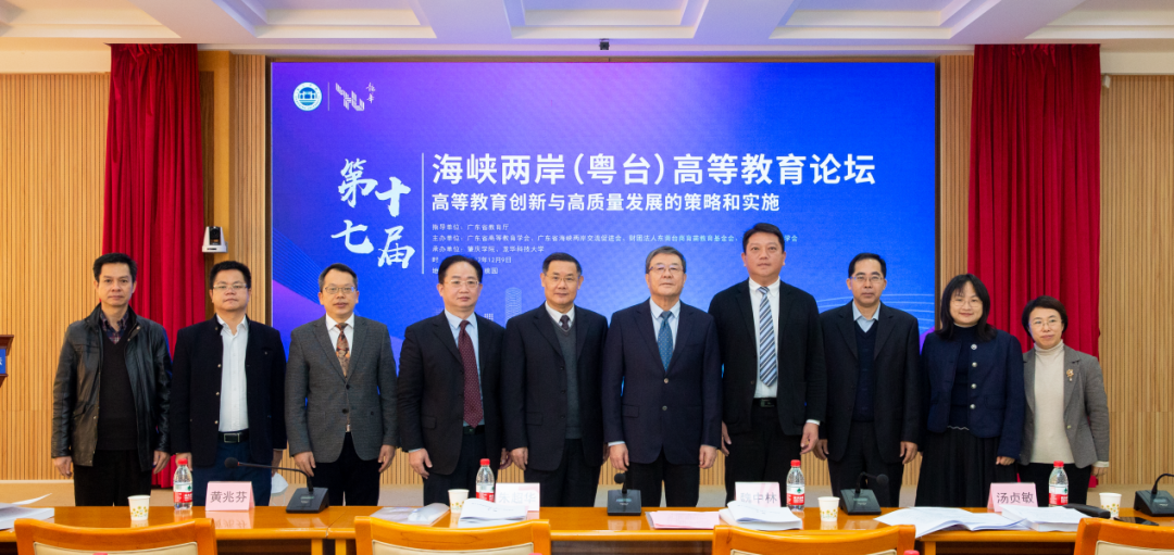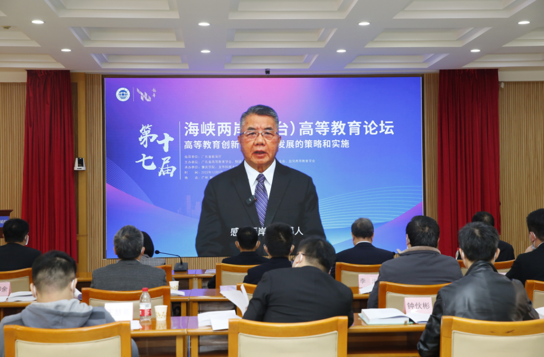 12月9日,第十七届海峡两岸(粤台)高等教育论坛在广东、台湾两个会场以线上线下相结合的方式举行。广东省教育厅一级巡视员朱超华,广东省人民政府台湾事务办公室副主任、一级巡视员黄兆芬,广东省高等教育学会会长魏中林,佛光山教团系统大学总校长杨朝祥,台湾大学教育系统总校长吴清基,bat365正版唯一官网院长吴业春,东莞台商育苗教育基金会董事长叶宏灯等出席论坛。线上参加论坛人员,包括粤台高校校长、专家学者、部门负责人,在大陆的台籍教师、台商和青年代表,东莞台商子弟学校暨东莞台商育苗教育基金会代表,共200余人。论坛共收录在粤高校专家学者、青年教师、研究生论文39篇。本届论坛围绕主题“高等教育创新与高质量发展的策略和实践”及相关议题进行深入研讨交流。广东省高等教育学会常务副会长、广东省教育研究院原院长汤贞敏研究员和龙华科技大学校长葛自祥教授共同主持论坛开幕式。图片