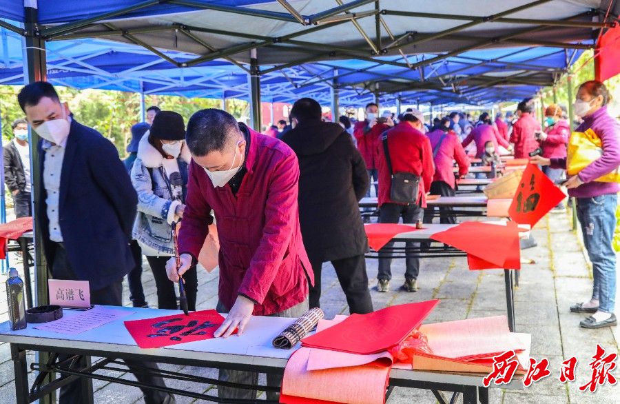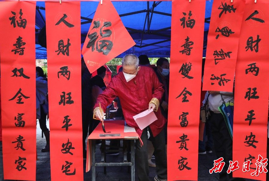“福气降临阖家福,春光辉映满堂春”“瑞日祥云弥画栋,春风淑景满华堂”……活动现场,众多书法家奋笔疾书,书写各式字体的“福”字和新春对联,没一会儿,一幅幅带着墨香的红色春联和福字呈现在大家面前,喜庆的年味儿扑面而来。作品还现场免费送给市民游客,让人们把“福”带回家。