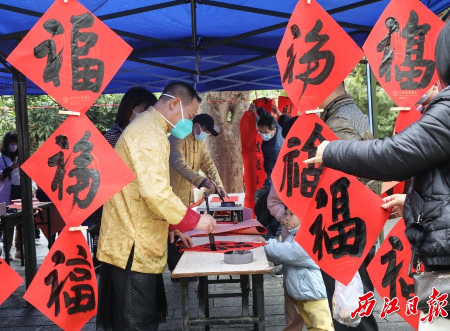 “过年嘛,贴春联,这是春节最具仪式感的环节。”市民陈晓与年幼的女儿领到“福”字后忍不住喜上眉梢,他表示这个活动在景区举办,不仅让人们可以领略旖旎风光,又能接受传统文化的熏陶,还营造了新春的浓厚氛围。