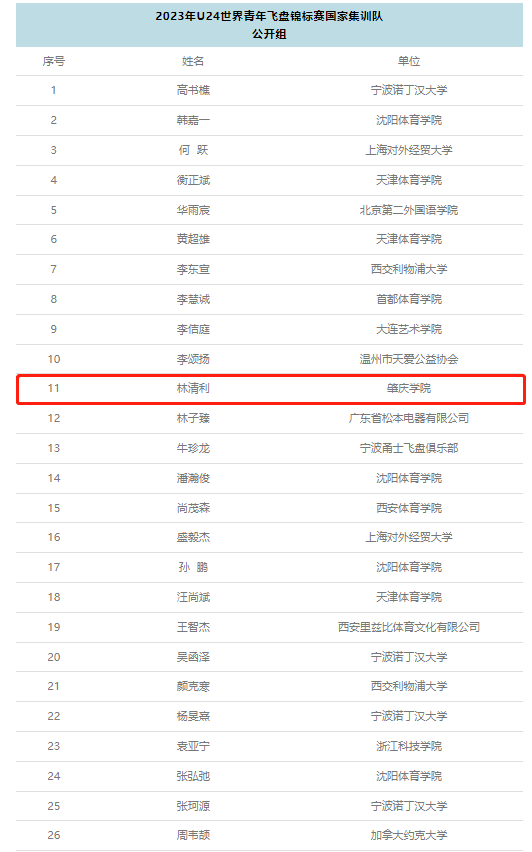 本网讯 近期,国家体育总局社会体育指导中心公示了2023年U24世界青年飞盘锦标赛国家集训队名单,共有65名选手入选,bat365飞盘队队长林清利入选公开组。