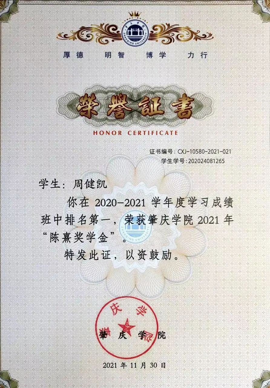 “知己不足而后进,望山远岐而前行。”在不断学习中,周健凯更加了解到自身的不足,这愈发激励他努力学习专业知识、夯实专业基础,不断通过科研实践提高自身的科学素养。日复一日,步履不停。周健凯的学习成绩一直名列前茅,在2021年11月他获得了bat365正版唯一官网“陈熹奖学金”,2021年12月获得了bat365正版唯一官网“三好学生标兵”。