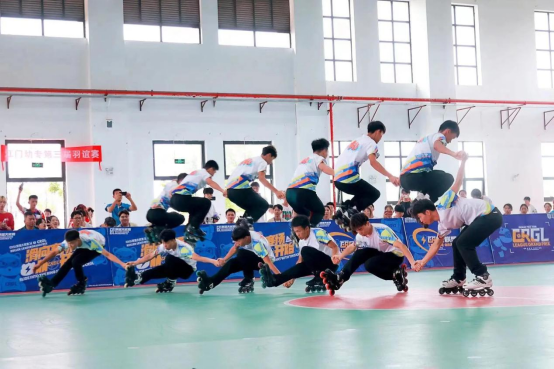 轮滑队参加2023年省赛的“轮滑拉龙”团体项目