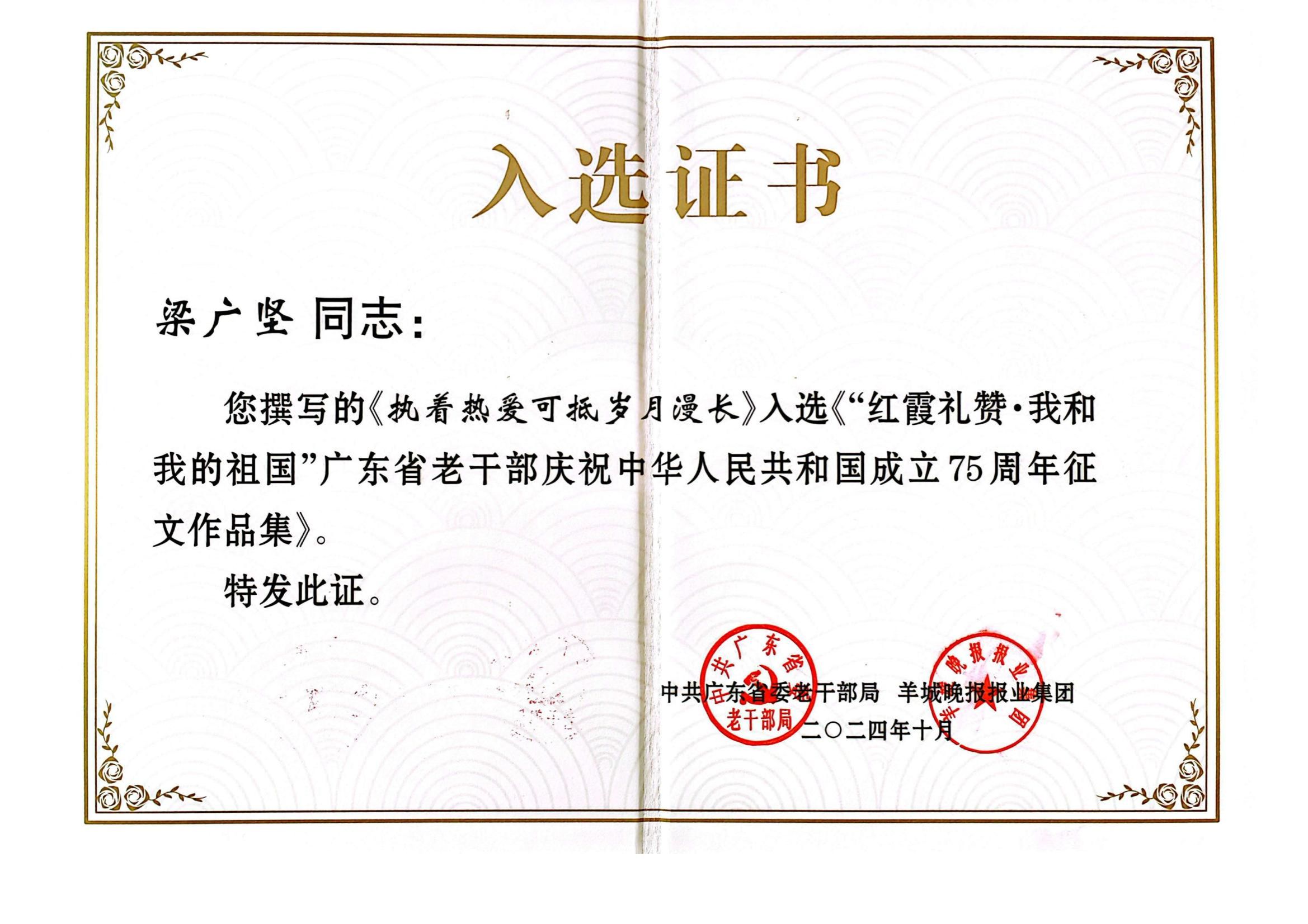 本网讯 近日,bat365退休教师梁广坚教授的征文作品《执着热爱可抵岁月漫长》成功入选《“红霞礼赞·我和我的祖国”广东省老干部庆祝中华人民共和国成立75周年征文作品集》。