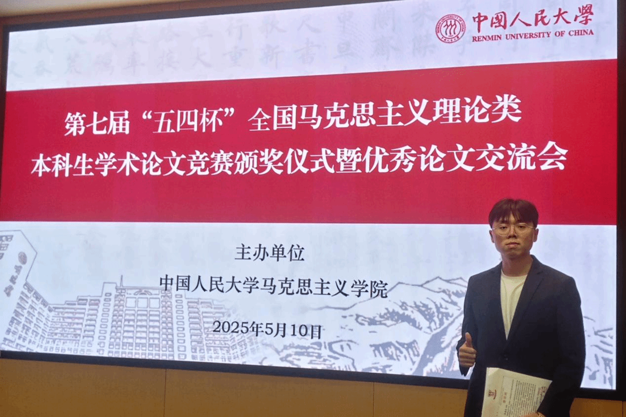 本网讯 5月10日,第七届“五四杯”全国马克思主义理论类本科生学术论文竞赛颁奖仪式暨优秀论文交流会在中国人民大学举行。马院2023级思想政治教育专业学生林嘉庆撰写的《大国竞争视阈下新质生产力的分合二重性》作为优秀论文代表受邀参会。