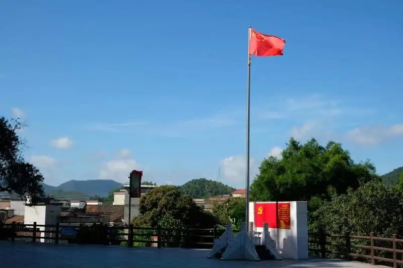 在中共云浮县委旧址前,一面在蓝天白云中高高飘扬的五星红旗吸引了我们的目光。93年前,这里有一面标着斧头镰刀的红色旗帜迎风招展,无数青年志士在它的引领下走上了革命的道路。