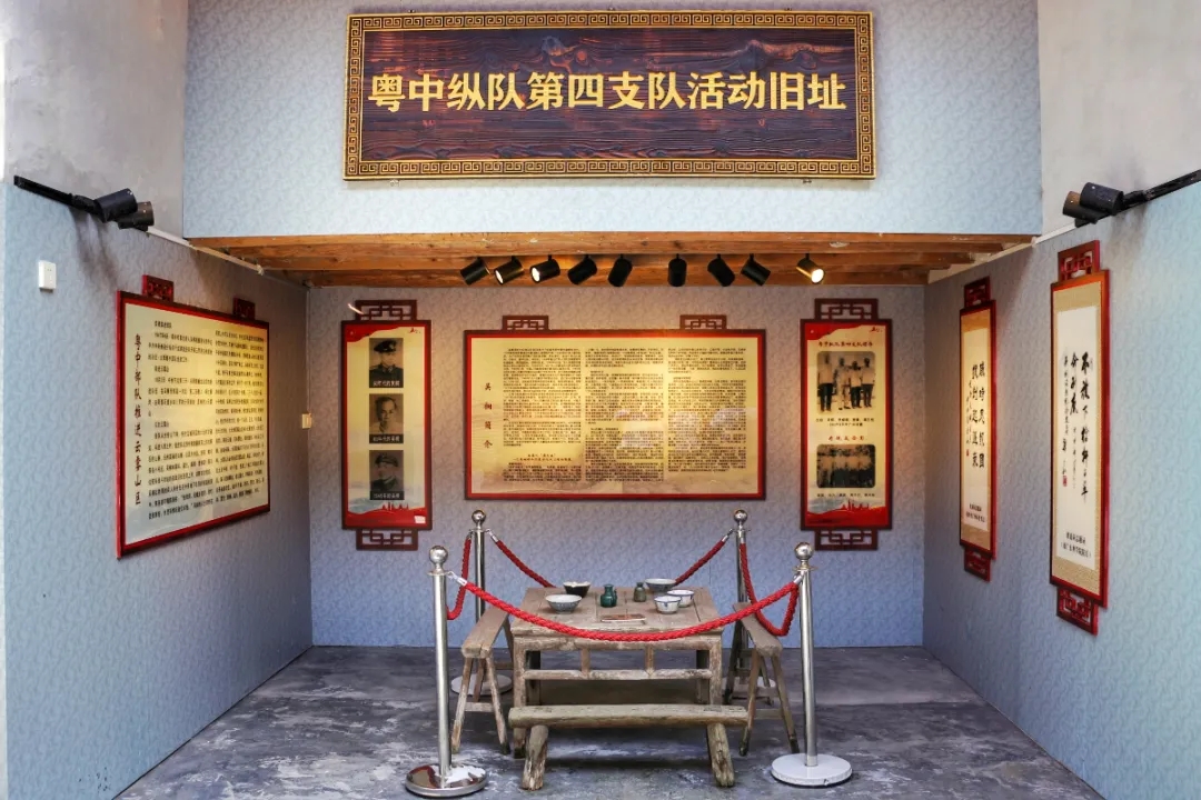 这是一间小房子,外墙砌青砖,屋顶盖瓦片,门的两旁悬挂着“爱国主义教育基地”等牌匾。跨过门槛,正前方是一个方方正正的天井。环顾四周,旧址修缮良好,处处细节还原历史,墙上的挂牌清楚地讲述了粤中纵队第四支队的革命历史。