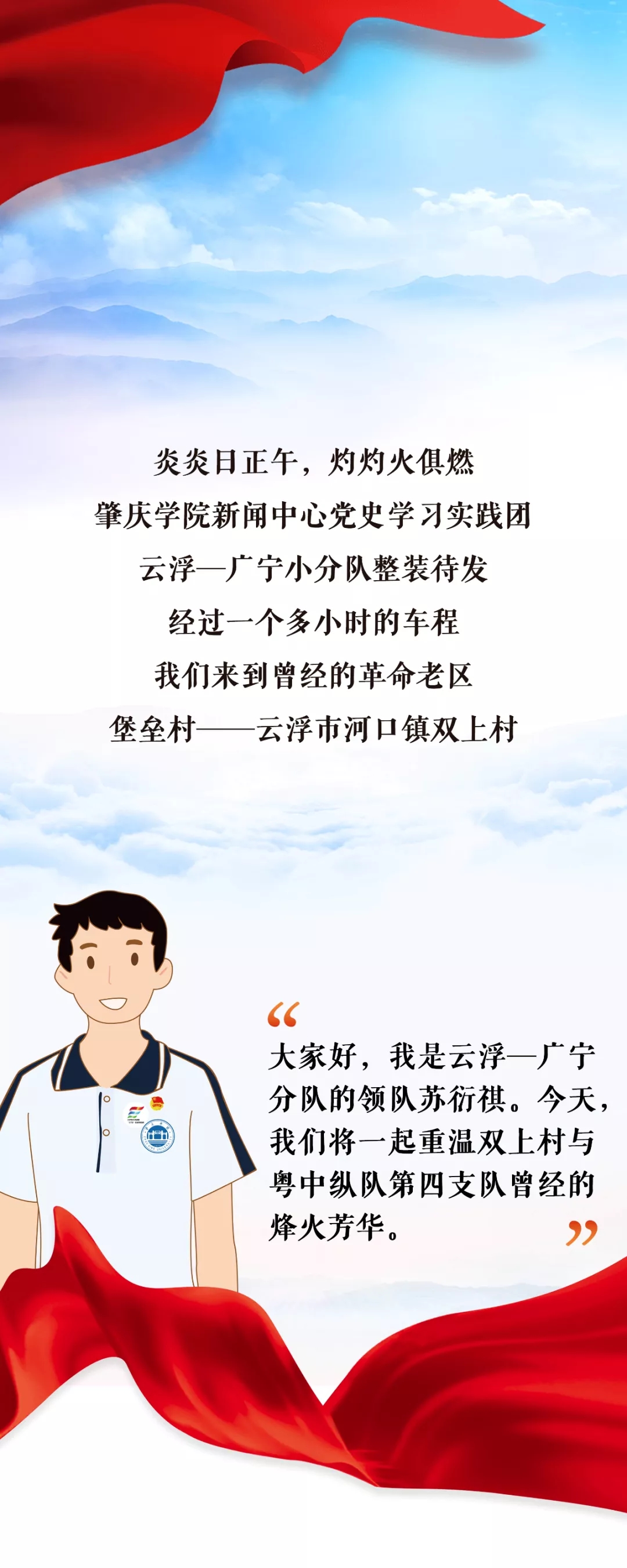 “星火燎原三罗地,红旗漫卷云雾山。”1947年6月,中共广东省委指示粤中地区从台南、高鹤等地抽调人员,组成一支挺进队(即粤中纵队第四支队)开赴三罗地区,创建以云雾山为中心的游击根据地。同年11月,为更好地开展革命武装斗争,挺进队全部分散隐蔽在双上村等各个小村庄,双上村的革命火种从此被点燃。