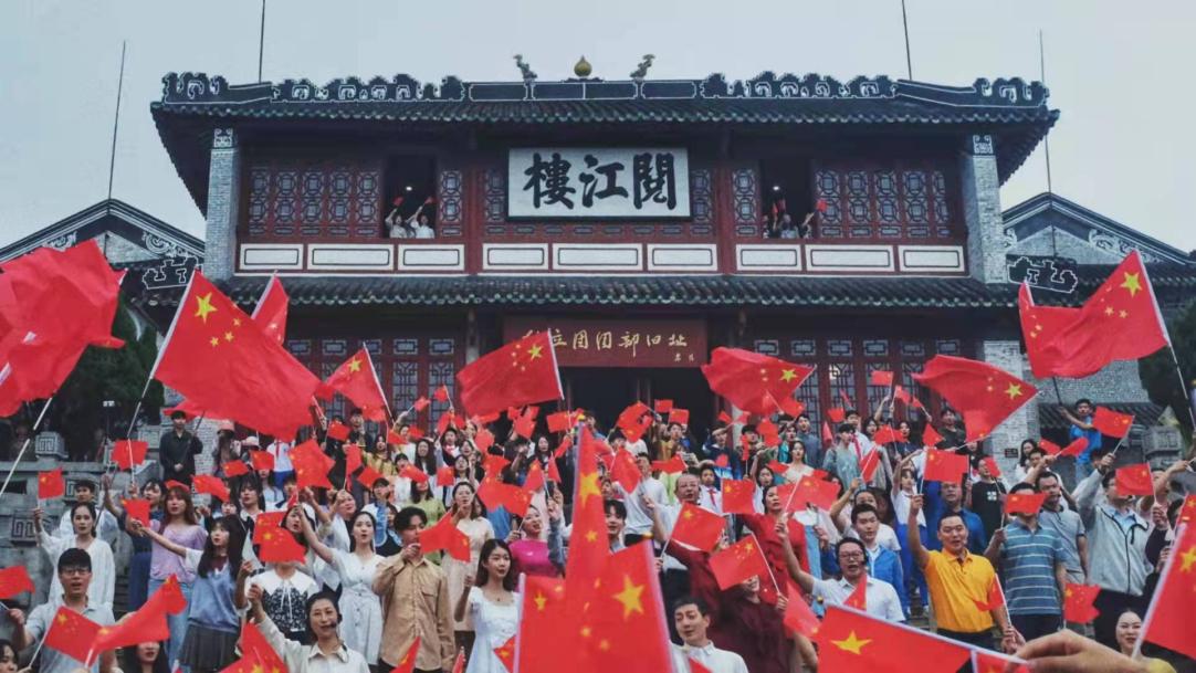 洪梓青摄影作品《阅江楼下红旗飘》拍摄于去年4月,他在现场参与了央视节目制作组为庆祝建党100周年在阅江楼进行的“我和我的祖国”快闪录制。当天虽然天气不佳,但演员们仍然热情高涨,在阅江楼下高举手中的五星红旗,放声高唱《我和我的祖国》,这一场面打动了洪梓青,他用相机定格下这一瞬间。